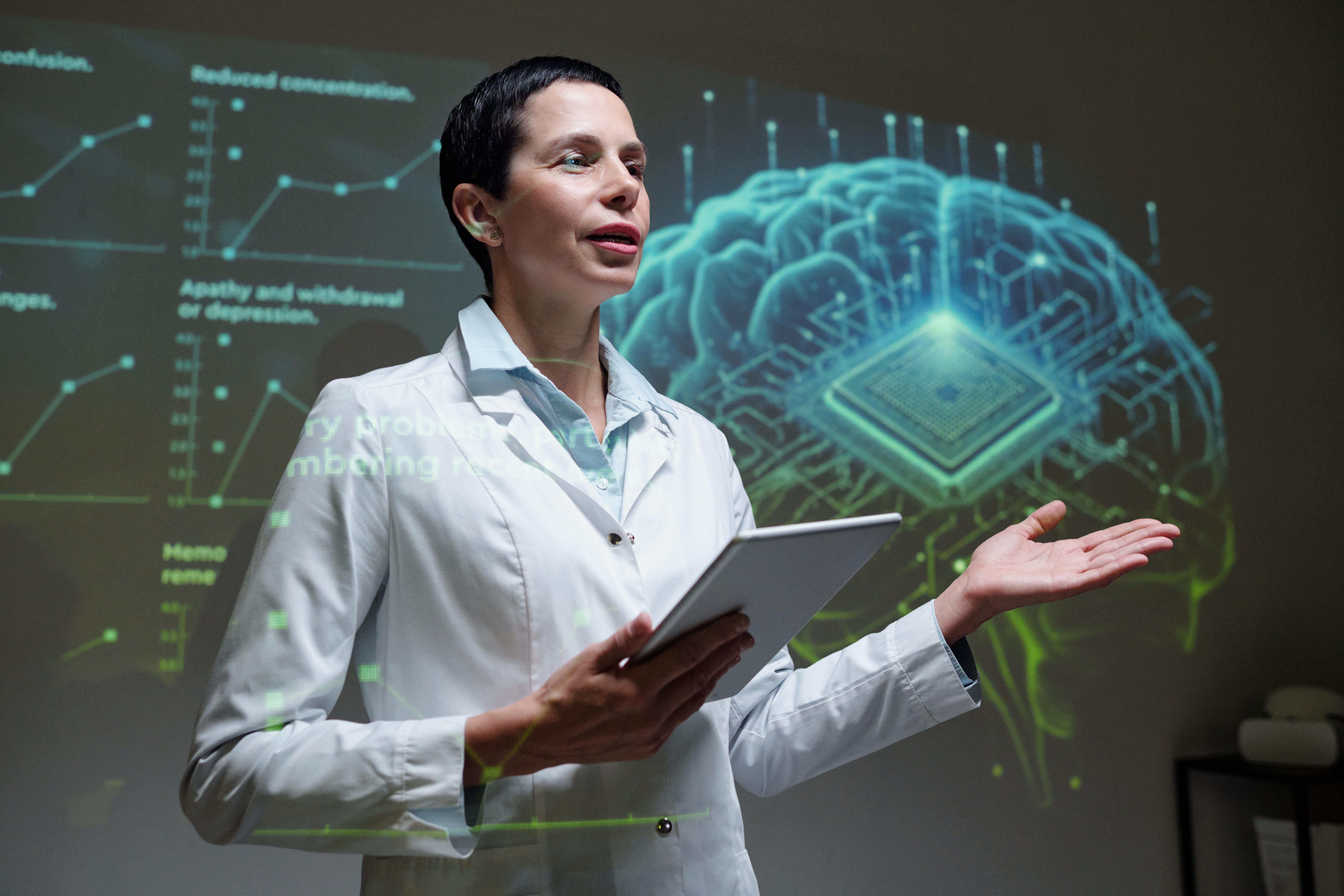Waist up portrait of female scientist on stage giving presentation on brain implants during medical conference copy space