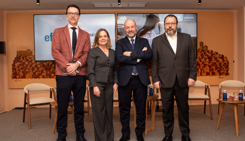 Matthijs van Meerveld, codirector de la Plataforma de Oncología de Efpia; Fina Lladós, presidenta de Farmaindustria; Alberto Jara, director gerente del SESCAM, y César Hernández, director de la Cartera Común de Servicios del SNS y Farmacia.